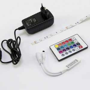 – RGB led vezérlő (IR) – 6A, 24 gombos, melynek segítségével a különböző színeket és effekteket lehet megjeleníteni, illetve a szalagot lehet ki-és bekapcsolni.