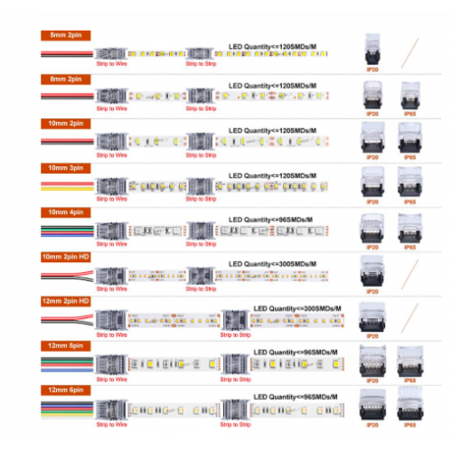 Mindez elérhető IP20-as változatban sima beltéri LED szalagokhoz, de IP65-ös változatban is a vízvédett LED szalagok toldásához, betáplálásához.