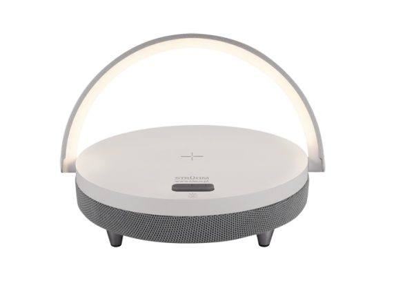 Strühm Saturn asztali lámpa fehér színben hangszóróval és vezeték nélküli telefontöltővel